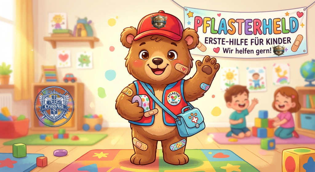 „Pflasterheld“ ist der liebevoll gestaltete Erste‑Hilfe‑Kurs für Kinder, begleitet vom mutigen Maskottchen Bärnardo. Spielerisch, kindgerecht und voller Entdeckerlust lernen die kleinen Heldinnen und Helden, wie sie in Alltagssituationen sicher reagieren können.